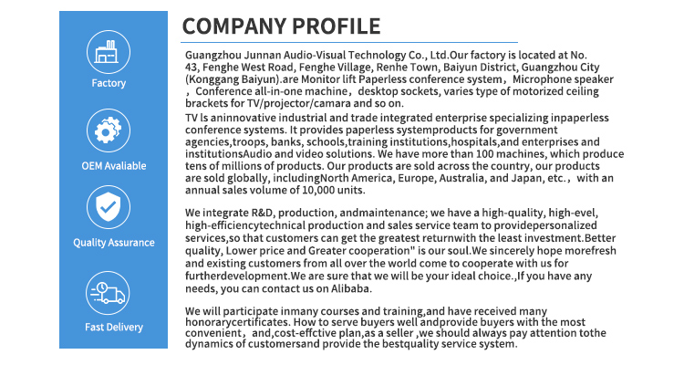 Οι προηγμένες ηλεκτρονικές οθόνες OLED LCD Monitor Lifter είναι κατάλληλες για όλα τα είδη σκηνών, διαθέτουμε τεχνολογία κοπής μηχανών CNC και τεχνολογία λέιζερ, Τελευταία τεχνολογία ανύψωσης οθόνης LCD για τραπέζι συνεδριάσεων για να διασφαλίσουμε ότι το προϊόν είναι εξαιρετικά υψηλών προδιαγραφών. Όλα τα ανυψωτικά LCD οθόνης OLED ανήκουν στην Made in China, διατίθενται για χονδρική αγορά, μπορούν να προσαρμοστούν ιδιωτικά για πελάτες και διαθέτουν αρκετό ηλεκτρικό ανυψωτικό οθόνης αφής LCD σε απόθεμα που υποστηρίζει γρήγορη παράδοση στους πελάτες. Και ο εξοπλισμός μας Junnan έχει μια ποικιλία πιστοποιητικών πιστοποίησης όπως CCC, πιστοποιητικό CE, ROHS, πιστοποίηση ISO, το προϊόν είναι ασφαλές και υψηλής ποιότητας, με εξαγωγική πιστοποίηση, είναι ένα άμεσο εργοστάσιο με ευνοϊκή τιμή, έχει το δικό του εργοστάσιο και λειτουργεί εδώ και πολλά χρόνια.